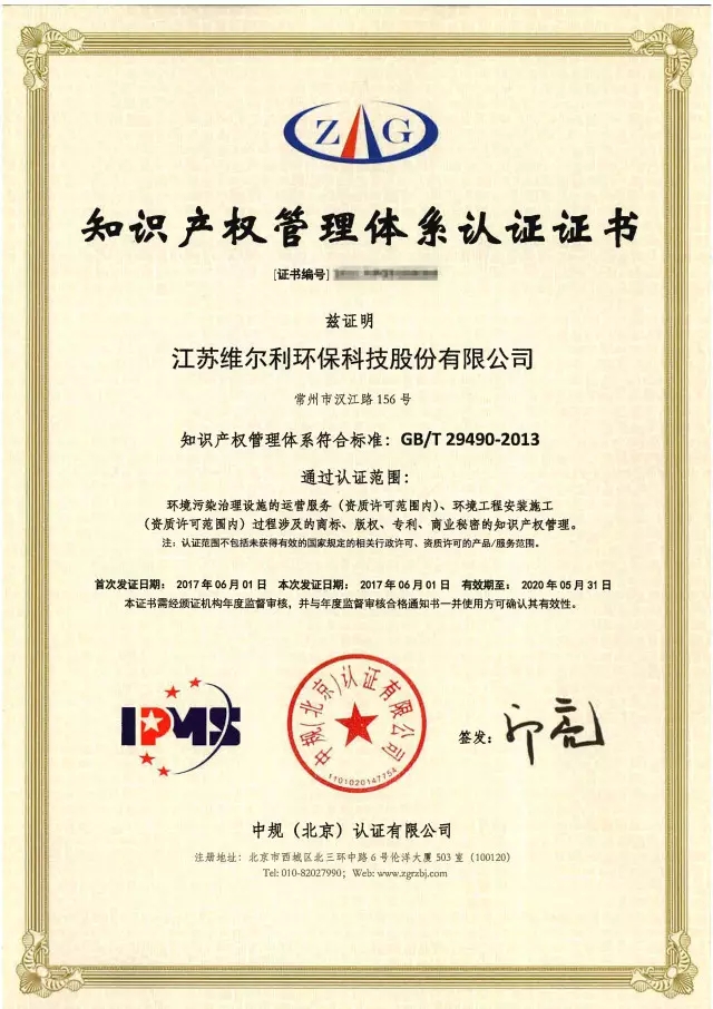 2017年6月,江蘇維爾利環(huán)??萍脊煞萦邢薰卷樌ㄟ^認(rèn)證,獲得GB/T29490-2013知識產(chǎn)權(quán)管理體系認(rèn)證證書。知識產(chǎn)權(quán)管理體系是國家知識產(chǎn)權(quán)局牽頭制定的一項(xiàng)國家標(biāo)準(zhǔn),旨在幫助企業(yè)建立科學(xué)、標(biāo)準(zhǔn)化的知識產(chǎn)權(quán)管理制度,形成貫穿生產(chǎn)經(jīng)營各環(huán)節(jié)的知識產(chǎn)權(quán)管理體系,實(shí)現(xiàn)對知識產(chǎn)權(quán)的獲取、維護(hù)、運(yùn)用和保...