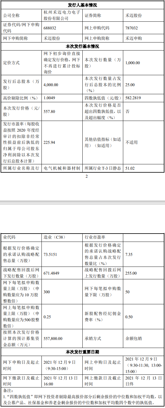 2021年12月9日,杭州禾邁電力電子股份有限公司正式申購。昨日,禾邁股份官宣發(fā)行價,業(yè)界沸騰! 557.80 元/股意味著什么? 意味著創(chuàng)下了A股歷史記錄,成為目前“最貴新股”,超過了8月義翹神州打新價(發(fā)行價為292.92元/股)。中一簽相當于要繳28萬元左右,發(fā)行市盈率...