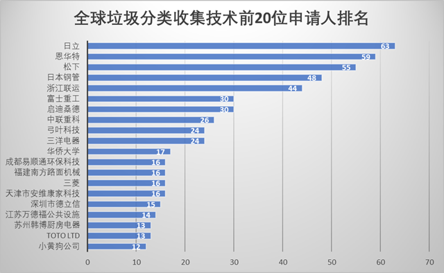 在全球垃圾收集分類領(lǐng)域?qū)@暾?qǐng)量排名前20的申請(qǐng)人中,日立作為世界五百?gòu)?qiáng)綜合跨國(guó)集團(tuán)在多個(gè)領(lǐng)域處于行業(yè)領(lǐng)先地位,與專注于垃圾處理技術(shù)并發(fā)明了第一套自動(dòng)垃圾收集系統(tǒng)的瑞典恩華特并駕齊驅(qū),緊隨其后的是另一家世界五百?gòu)?qiáng)企業(yè)松下。浙江聯(lián)運(yùn)、啟迪桑德、以及成立于2018年并致力于將人工智能和大數(shù)據(jù)技術(shù)應(yīng)用于垃...